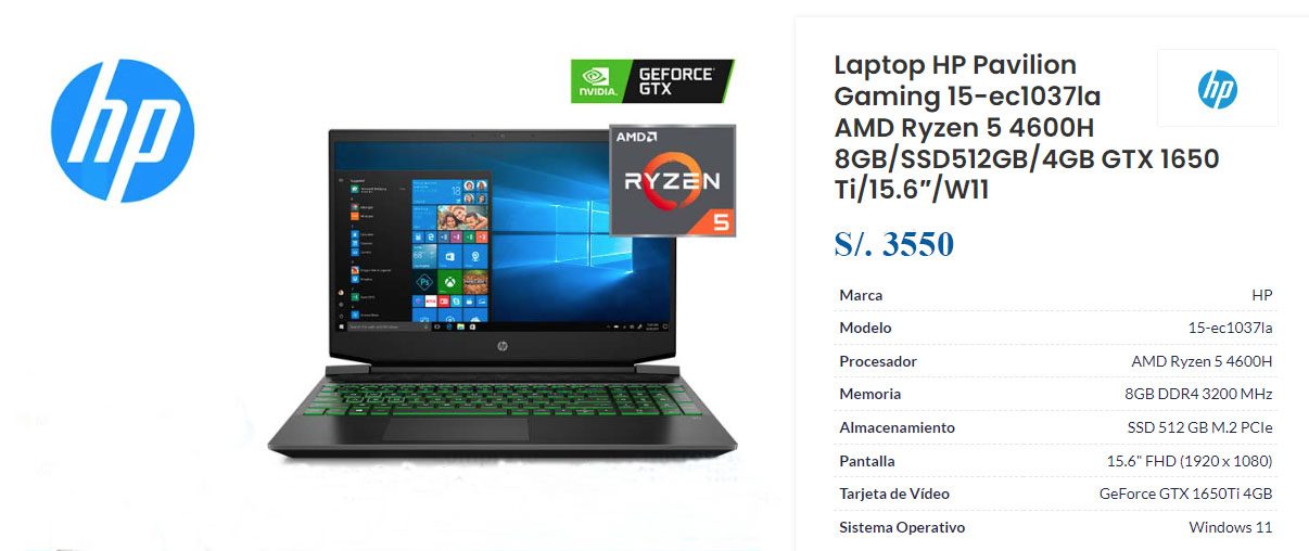 PROCESADOR AMD RYZEN 5/ 8 GB RAM / DISCO SOLIDO 512 GB / TARJETA DE VIDEO PURA GTX 1650 DE 4 GB